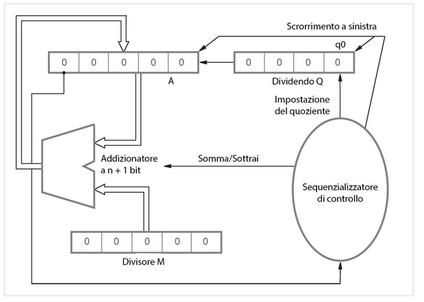 | Contiene la rappresentazione grafica del circuito utilizzato per la divisione binaria. Le componenti principali sono: Divisore M, contenente il divisore inserito nell'apposito input, suddiviso in celle (ogni cella contiene un singolo bit). Il registro resta costante; Dividendo Q, registro contenente inizialmente l'input inserito nel Dividendo (suddiviso anch'esso in celle), al termine delle operazioni conterrà il quoziente della divisione; Registro A, inizializzato a "00000" e contenente passo passo il risultato della sottrazione di esso con il divisore, e se negativo (in modalità "CON RIPRISTINO"), viene ripristinato sommando ad esso il divisore sottratto nell'operazione precedente. Al termine delle operazioni, conterrà il resto della divisione; Addizionatore a n+1 bit (poiché la somma potrebbe avere un bit di overflow), che effettua la somma dei registri A e M (contenente il divisore); Sequenzializzatore di controllo, controlla l'ultimo bit del registro A e determina se il numero è positivo o negativo; |
