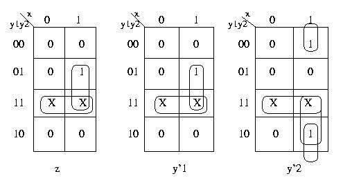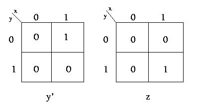 Dalla tabella delle transizioni possiamo facilmente ottenere le mappe di Carnaugh per le 2 funzioni booleane z e y'