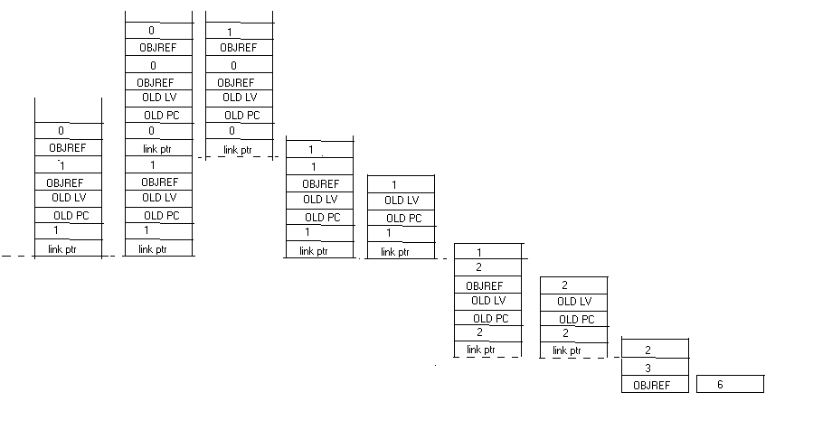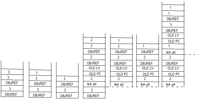 La situazione dello stack durante l'intera valutazione del fattoriale di 3 è la seguente: